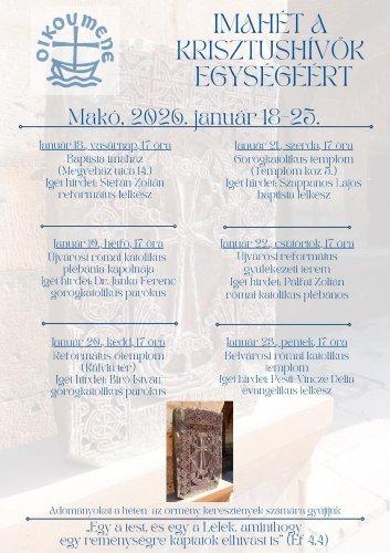 Január 18-án kezdődik a keresztények egységéért végzett imahét. A nyitó alkalom 17 órakor a baptista imaházban lesz. Igét hirdet Stefán Zoltán református lelkész. Az újvárosi plébánia kápolnájában hétfőn 17 órától gyűlünk össze, a belvárosi templomban az imahét záróalkalmát pénteken 17 órától tartjuk. További helyszínek és időpontok a plakáton olvashatók.